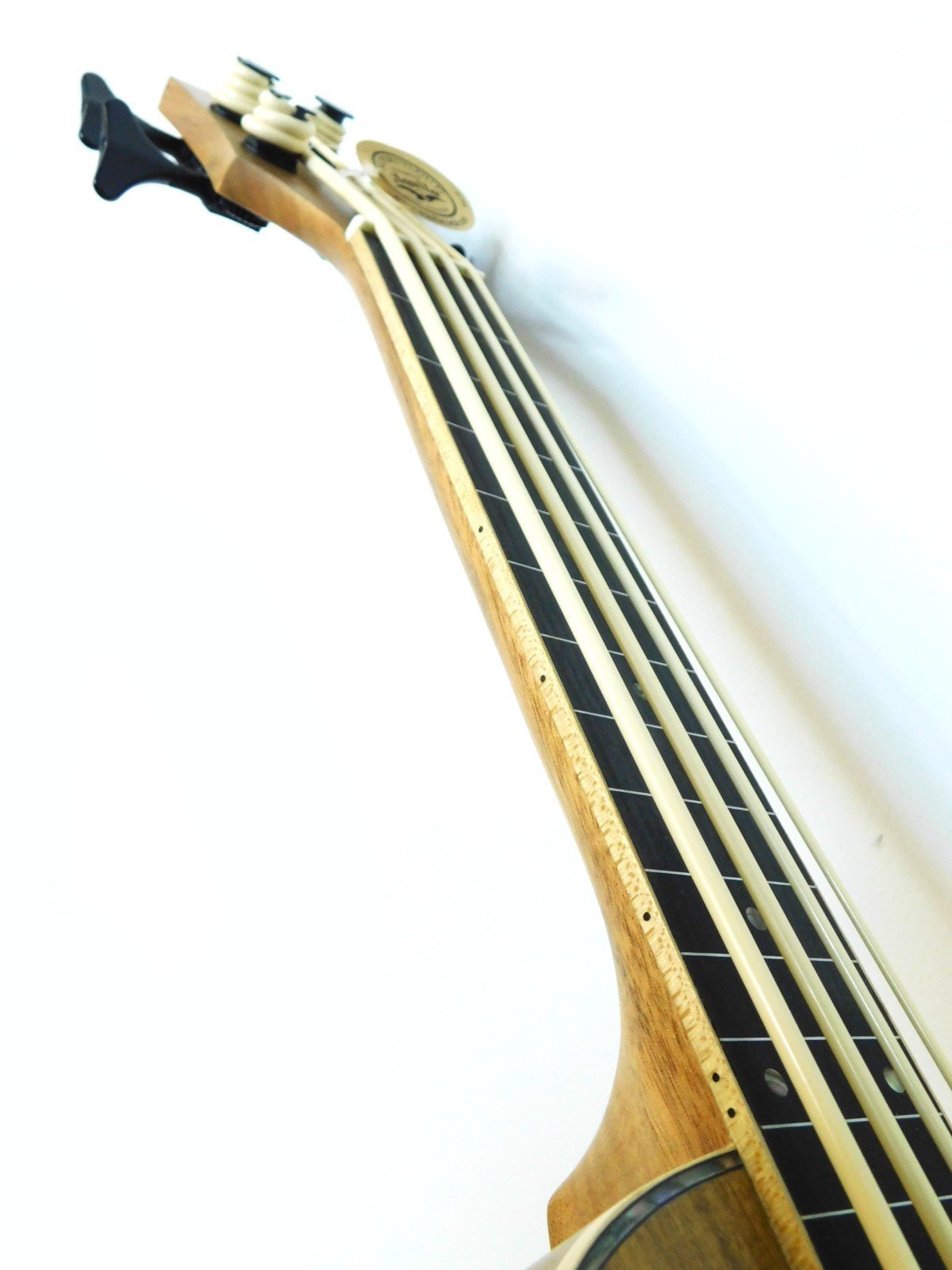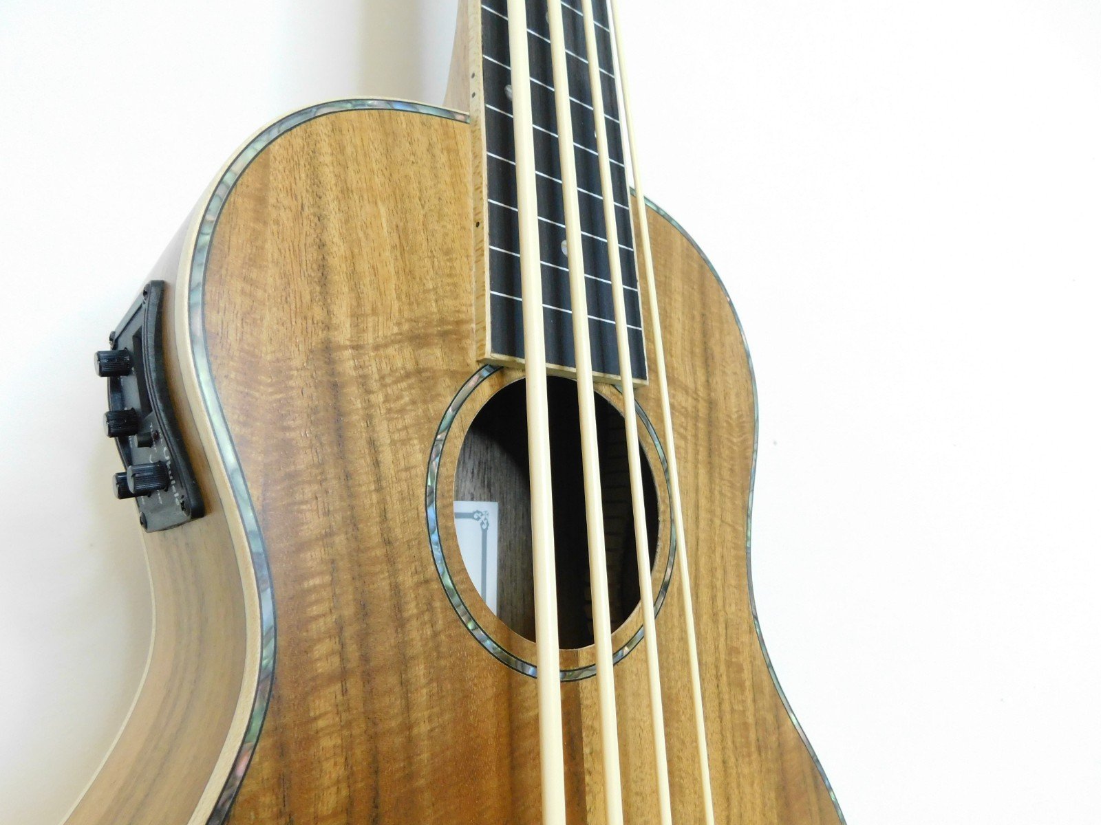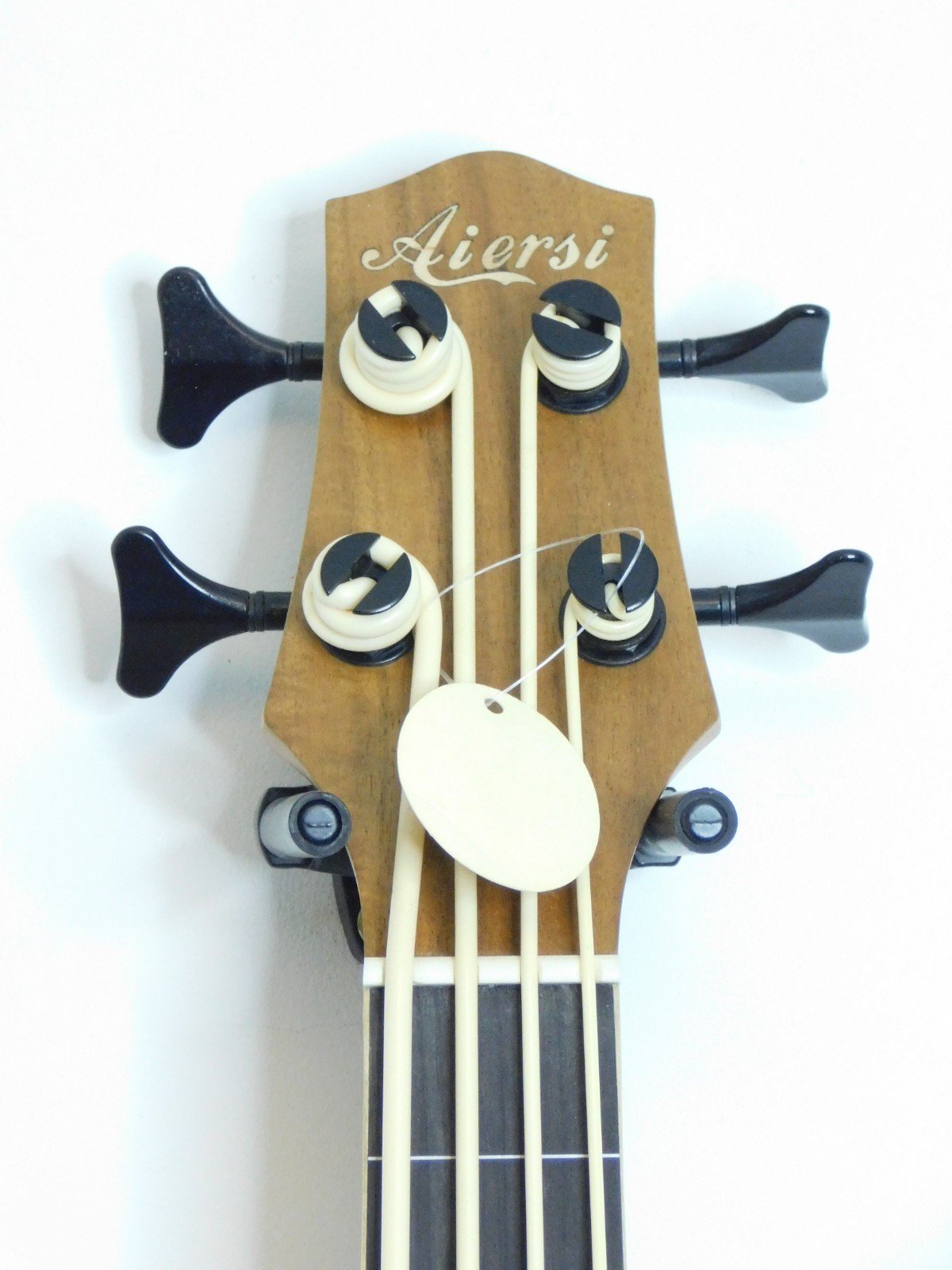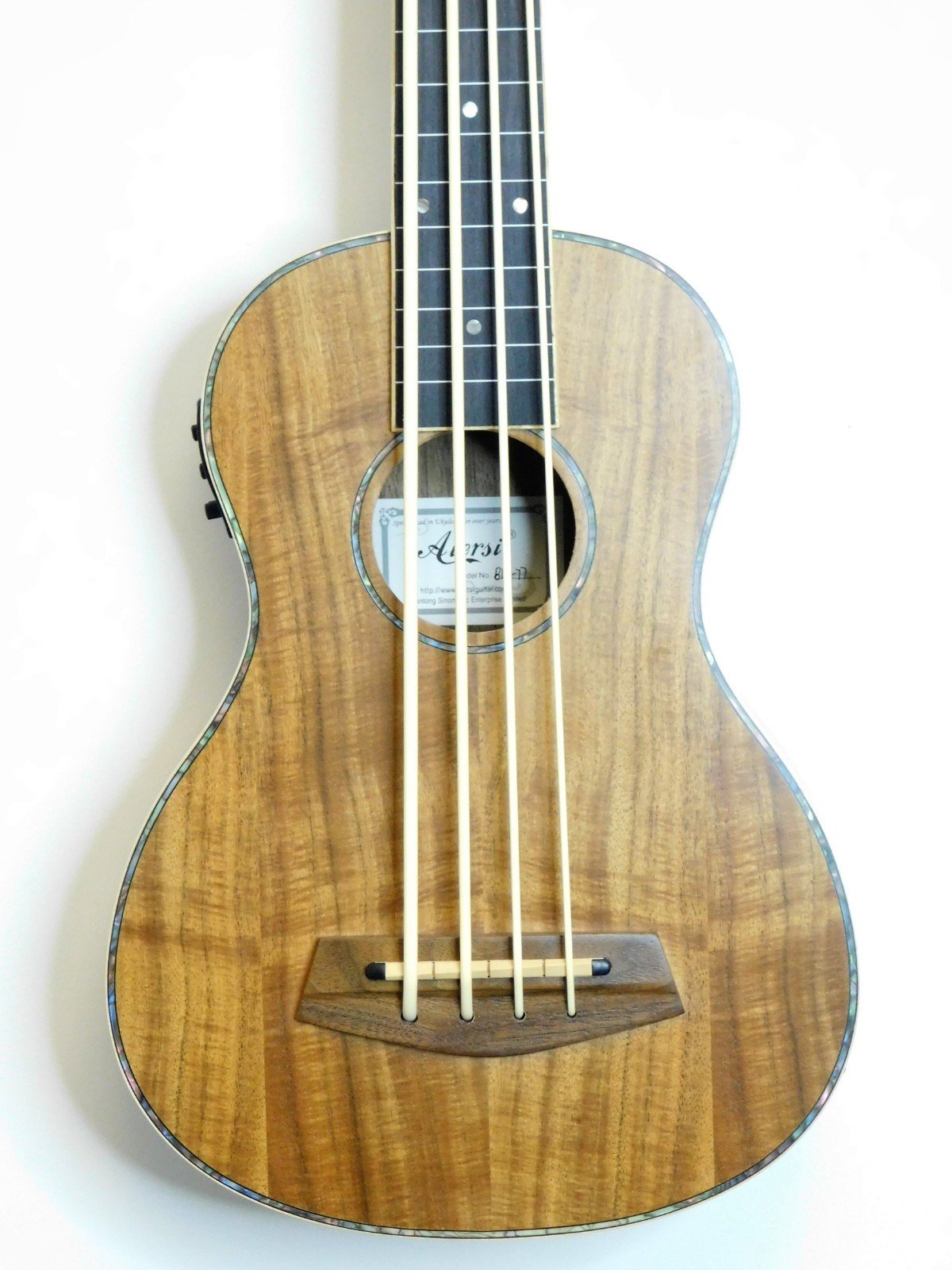 These beautiful koa ukulele basses from Aiersi offer classic double bass style tone either acoustically or amplified, in a small and very playable package! Their koa bodies have a gorgeous golden grain which is brought out nicely by the smooth satin finish and offset with attractive maple binding and faux abalone binding. The mahogany neck has a very comfortable slim D profile and the Aquila thundergut strings are very easy to hold down. The playing action is comfortably low and the clear, white markers make it very intuitive to find the correct points on the fretboard for accurate intonation. The hardware is quality too, with precise and reliable black geared tuners and a superb sounding under-saddle pickup and side mounted preamp. The preamp offers a wide range of tonal options with simple volume and three band EQ controls. There’s also a built-in tuner which is very precise and even works on the lowest notes this instrument can produce (the E equivalent to the bottom string of a standard bass guitar), meaning that you’ll never have to worry about tuning up in loud environments.