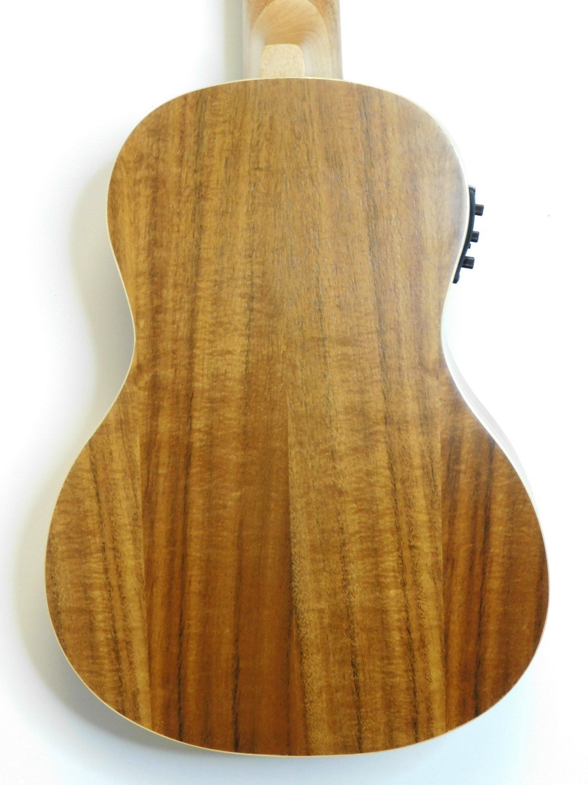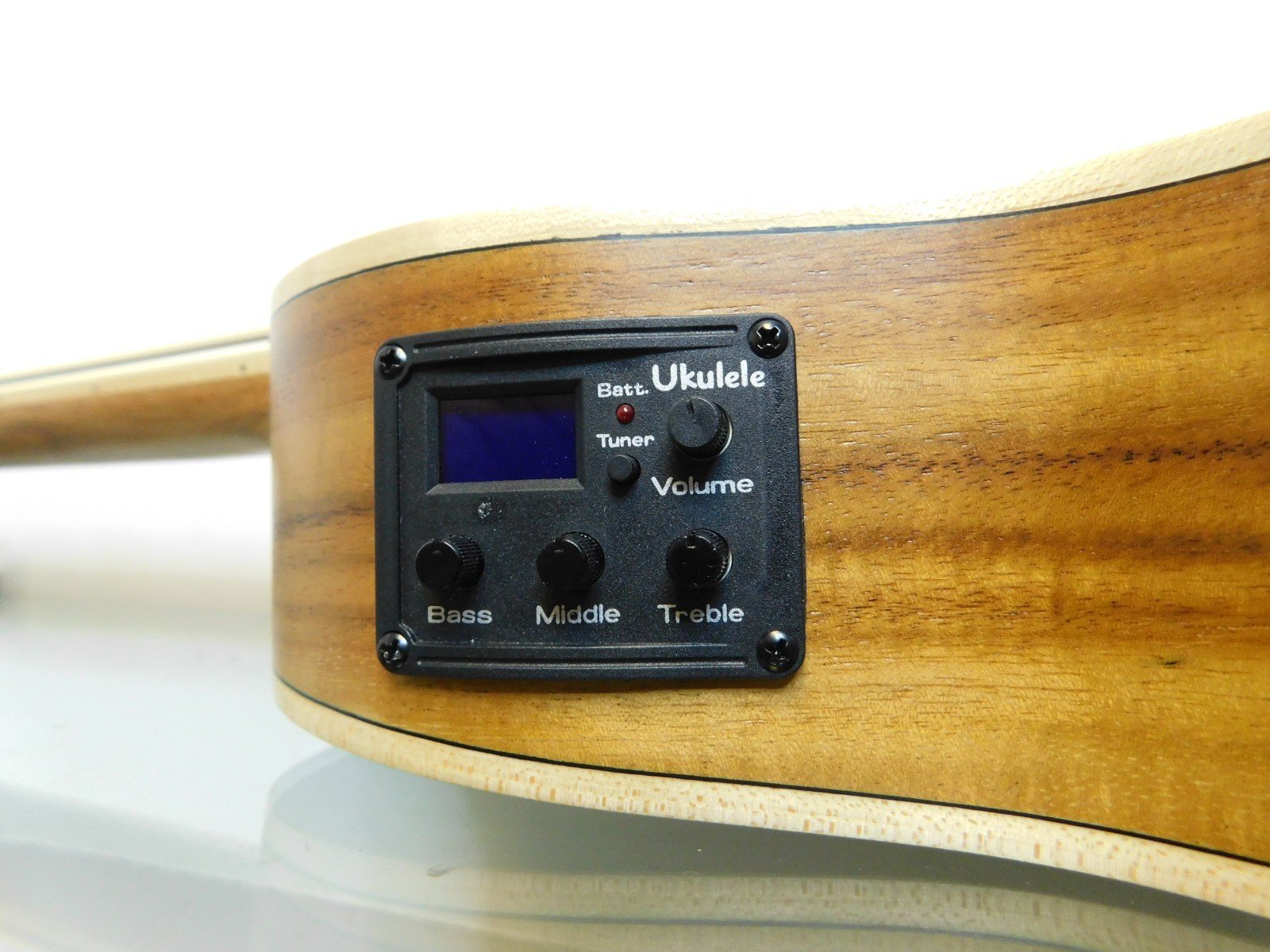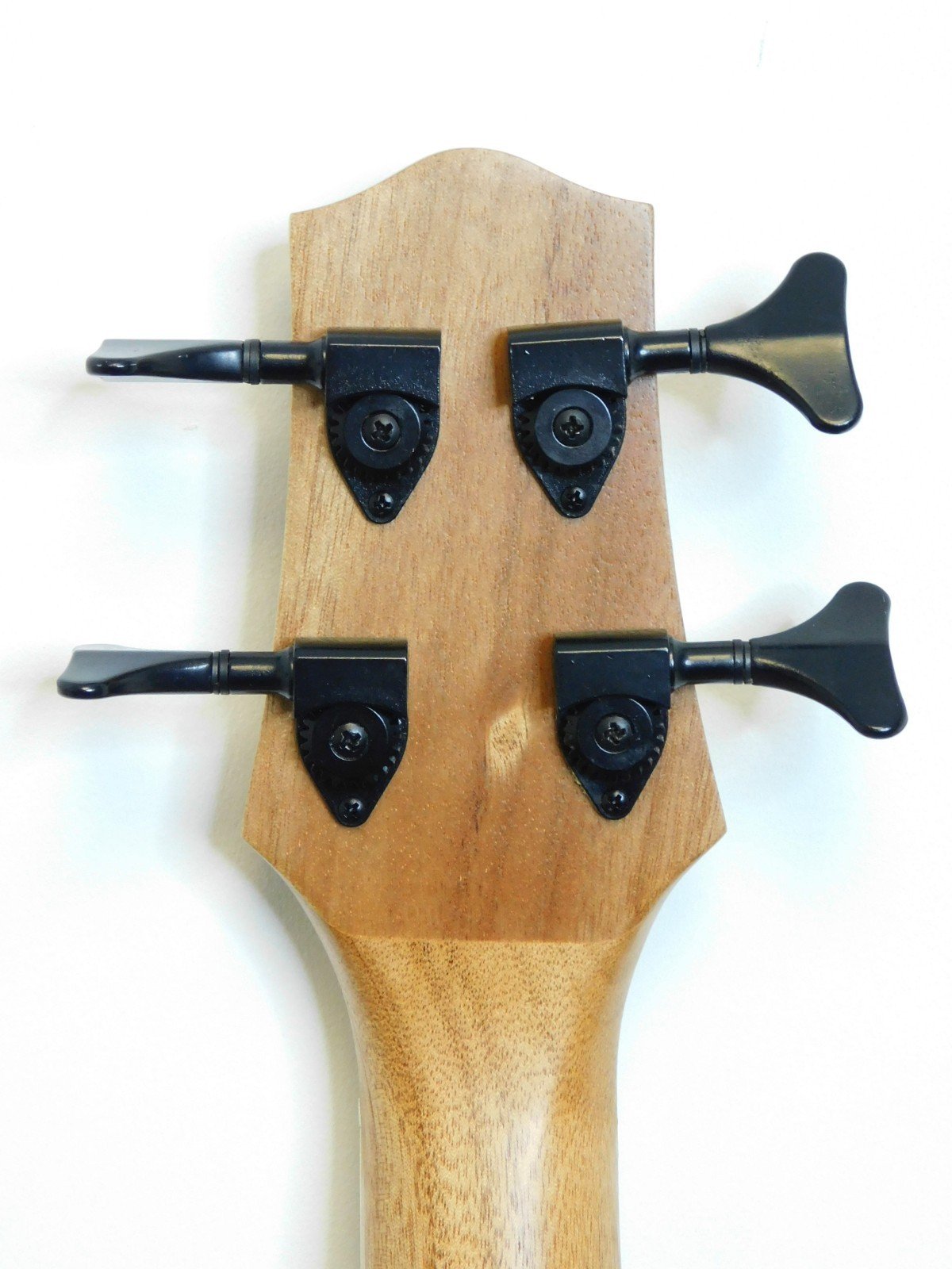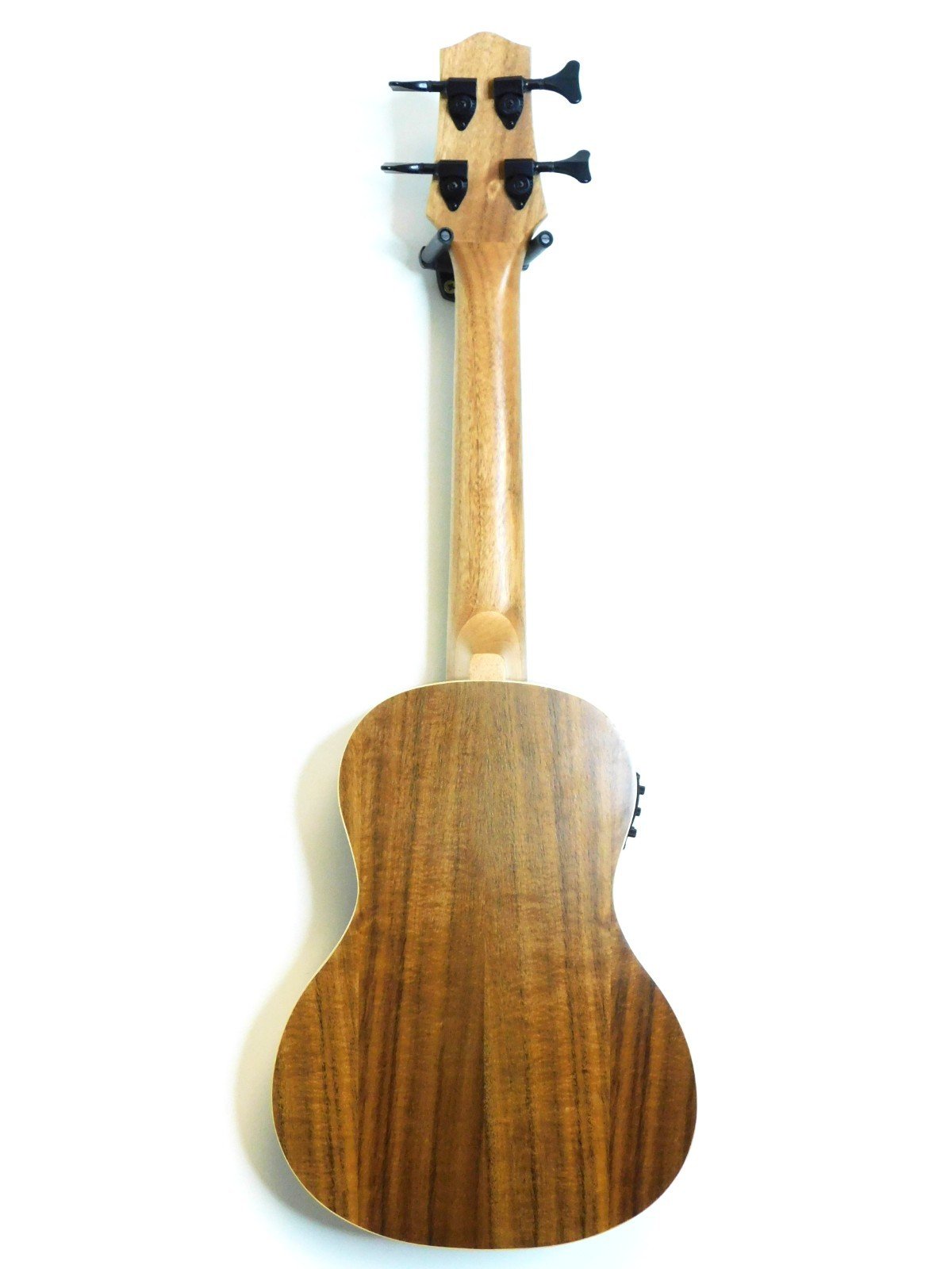 These beautiful koa ukulele basses from Aiersi offer classic double bass style tone either acoustically or amplified, in a small and very playable package! Their koa bodies have a gorgeous golden grain which is brought out nicely by the smooth satin finish and offset with attractive maple binding and faux abalone binding. The mahogany neck has a very comfortable slim D profile and the Aquila thundergut strings are very easy to hold down. The playing action is comfortably low and the clear, white markers make it very intuitive to find the correct points on the fretboard for accurate intonation. The hardware is quality too, with precise and reliable black geared tuners and a superb sounding under-saddle pickup and side mounted preamp. The preamp offers a wide range of tonal options with simple volume and three band EQ controls. There’s also a built-in tuner which is very precise and even works on the lowest notes this instrument can produce (the E equivalent to the bottom string of a standard bass guitar), meaning that you’ll never have to worry about tuning up in loud environments.