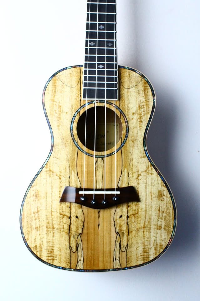 The SU084 is a clear and punchy sounding concert ukulele which really cuts through well in a group. It has an all-maple body with a really beautiful spalted grain pattern, framed with attractive faux abalone binding which looks beautiful when it catches the light. This is paired with a mahogany neck with attractive cream coloured binding and very clear front and side fretboard markers so you won’t get lost as you move up the neck!